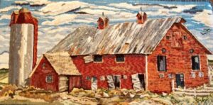 The adaptation of this pattern occurred as this pattern is no longer in print. I redrew and adapted the pattern with a few changes. This pattern was a challenge to complete on such a large scale. The entirety of the barn was hooked with a plaid fabric, using different parts for the sunny side and