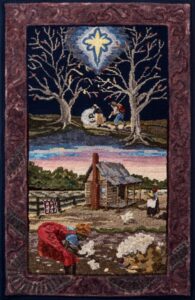 Sweet Chariot, is a story rug that depicts the Underground Railroad of the last century. The struggles that were faced to secure freedom. Starting in the foreground … the woman is picking cotton, while the baby is being cared for by an elder. The chicken in this case has the freedom to run free… The
