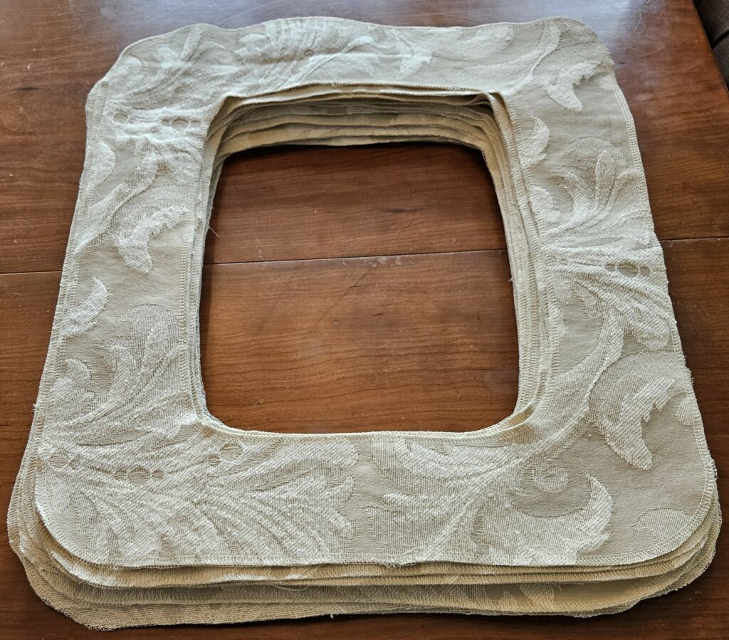Chairpad sized pattern can be worked as a 14″ x 14″ square mat – OR – as a 13.5″ diameter chairpad. Pattern is on linen with serged edges, designed and drawn by Sylvia Gautheir